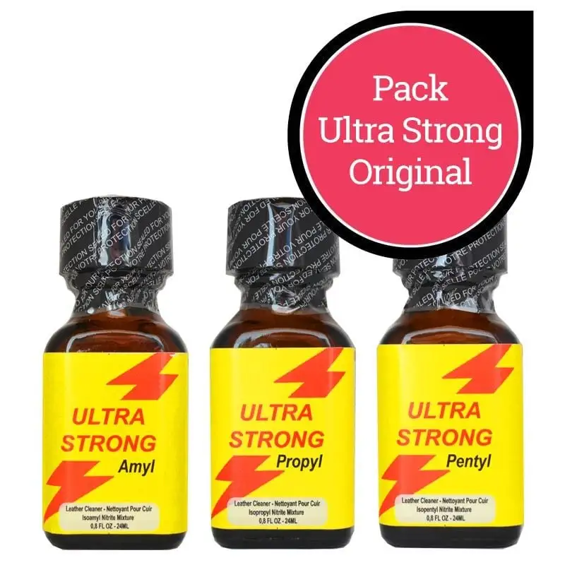 Ce pack de poppers Ultra Strong est composé des 3 poppers de la gamme Ultra Strong à savoir, le Poppers Ultra Strong Amyl, le poppers Ultra Strong Propyle et le poppers Ultra Strong Pentyle.