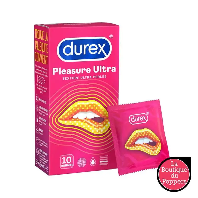 Découvrez les préservatifs Durex Pleasure Ultra pour plus de plaisir. Grâce à leur texture ultra perlée, faîtes le plein de sensations. Boite de 10 préservatifs avec lubrification standard à base de silicone.