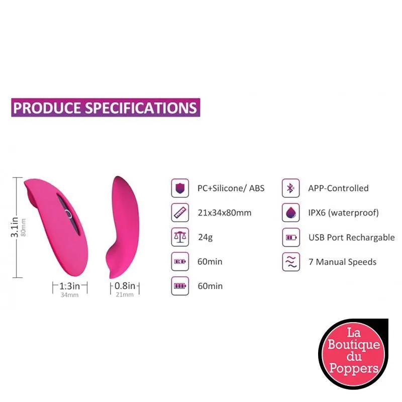 Laissez votre partenaire contrôler votre plaisir ! Grâce à sa connection par smartphone, vous pouvez contrôler ce stimulateur à distance. Rythme des vibrations et intensité. 7 modes de vibration. Réagit à la musique et aux sons de la voix. Autonomie 1H à pleine puissance. Recharge par USB.